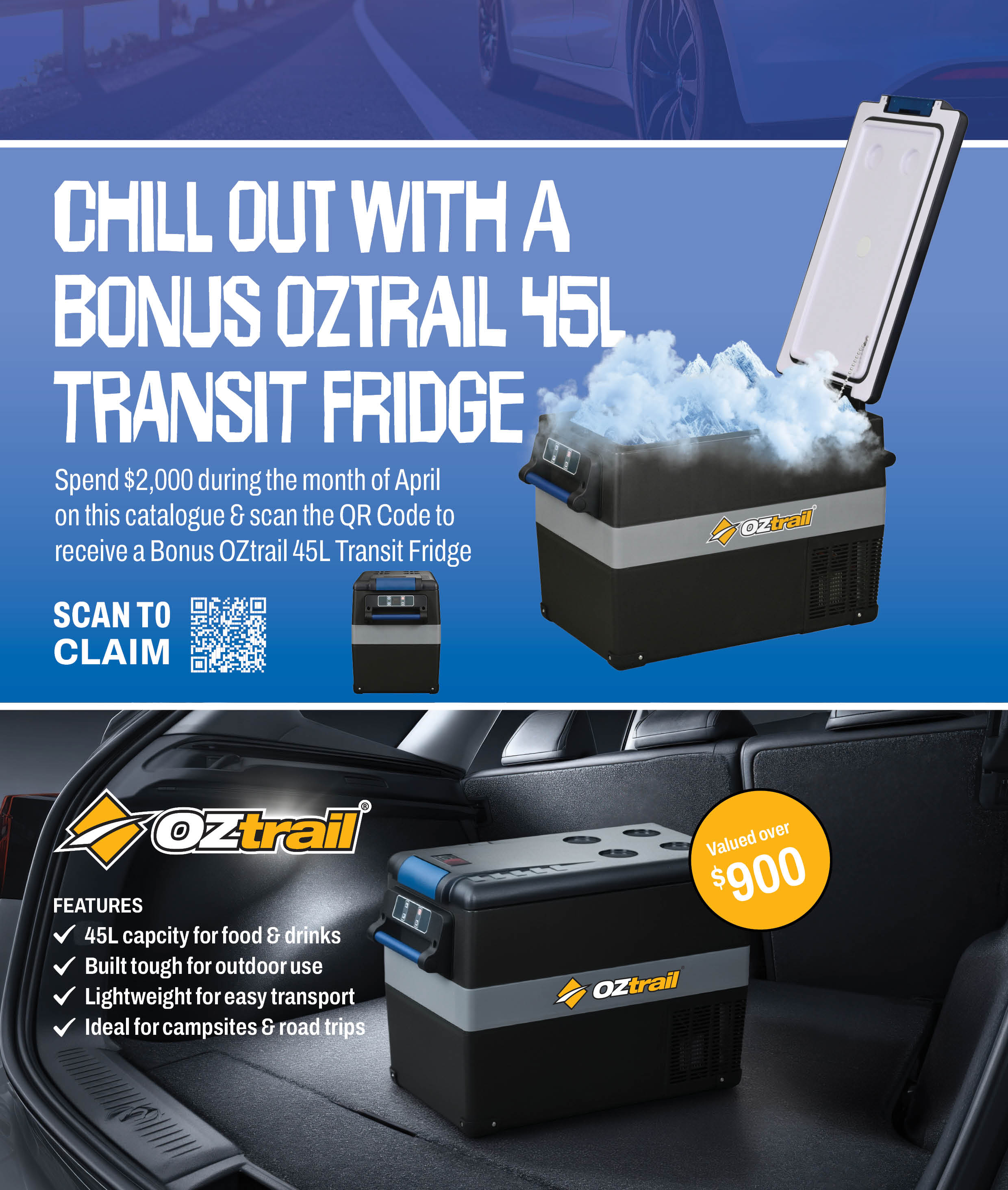 Claims must be submitted by May 4th, 2026. To receive the Bonus OZtrail Transit Fridge you must place one or more orders on April catalogue products accumulating to no less than $2,000 (ex GST & Freight) using your Natrad Trade Account during the promotional period. While stocks last. Wholesale accounts excluded. Allow up to 3 weeks for Bonus delivery. E&OE.
